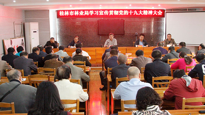 会议强调,要深刻领会党的十九大精神实质,重点把握好"八个深刻领会",深刻领会党的十九大的核心主题,深刻领会党和国家事业发展取得的辉煌成就,深刻领会我国发展历史新方位的重大意义,深刻领会新时代我国社会主要矛盾的重大判断,深刻领会习近平新时代中国特色社会主义思想和基本方略的丰富内涵,深刻领会"分两步走"新目标的战略安排,深刻领会加快生态文明体制改革和建设美丽中国的重大部署,深刻领会新时代党的建设的总体要求。始终坚持以习近平新时代中国特色社会主义思想为指引,奋力谱写桂林现代林业建设新篇章。