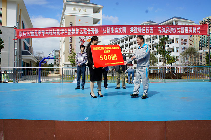 花坪管理局分别与两所社区学校举办了"弘扬生态文明,共建绿色校园"的生态文明系列宣传教育活动,并赠送牌匾活动中,花坪党支部以多种形式普及生态知识:组织学生代表宣读"传播生态文明,共建绿色校园"倡议书邀请同学们在"爱护环境,美化校园"签名墙上签名,举办生态书画展览,开展了花坪生态知识抢答赛活动等。花坪管理局还向两所社区学校赠送《美丽桂林 神奇花坪》校本教材各500册、生态宣传资料一批。
