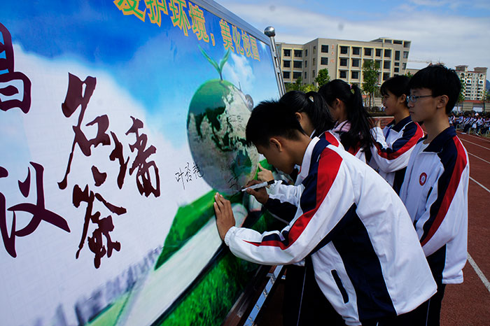 同学们在"爱护环境,美化校园"签名墙上签名