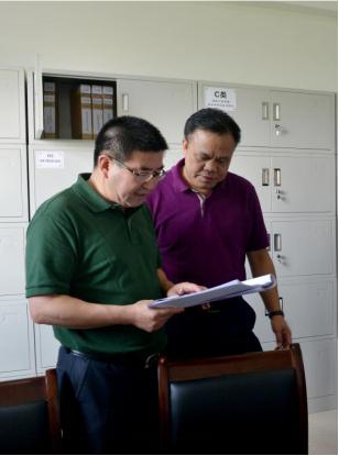 国家林业局湿地保护管理中心副主任严承高(左一)在对桂林会仙湿地国家湿地公园工作档案进行检查